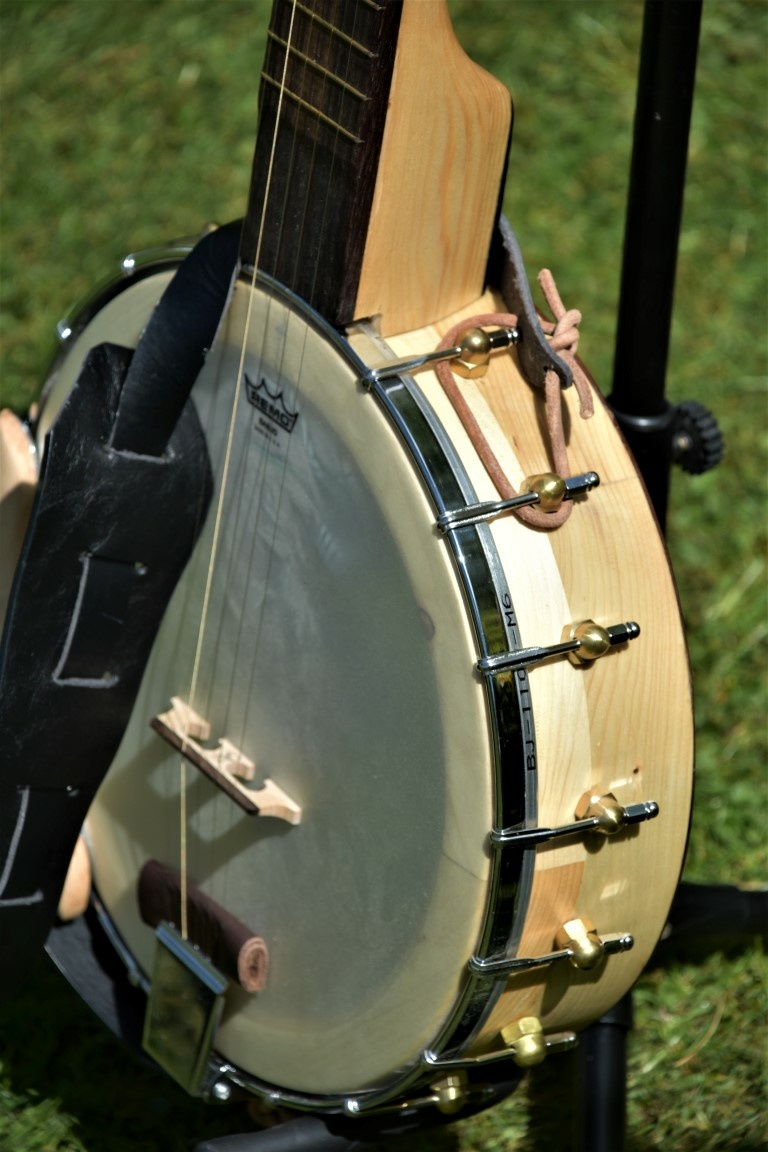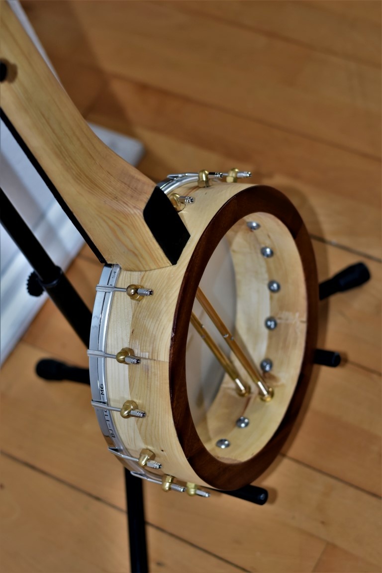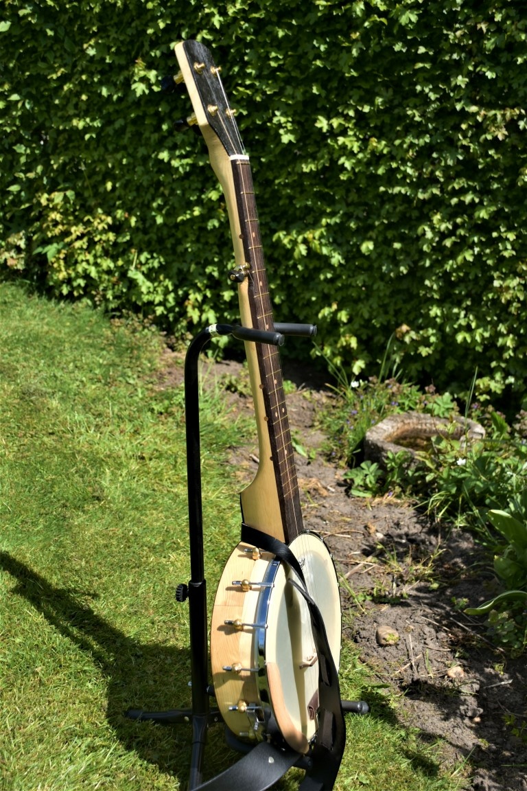 Efter at banjoen blev færdig er jeg blevet glædeligt overeasket. Den spiller rigtig fint, tydeligt og med god kraft. Helt på højde med andre banjoer. Den har sin egen lydprofil og ligger i den lyse ende af tonespectret. Mangler ikke kraft. Potten er mere massiv og kraftig end mine øvrige banjoer. Dette for at gøre den robust og for at øge kontaktfladen imellem træ og fiberskindet. Halsen er lamineret med 5-7 granlister på højkant.